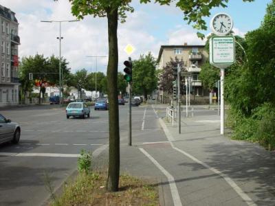 Das übliche Spielchen: 30m benutzungspflichtiger Radweg vor einer Kreuzung danach kann man mit etwas Elan wieder auf die Fahrbahn wechseln. Warum da unter der Uhr Werbung für ein Bestattungsunternehmen gemacht wird? | ||||